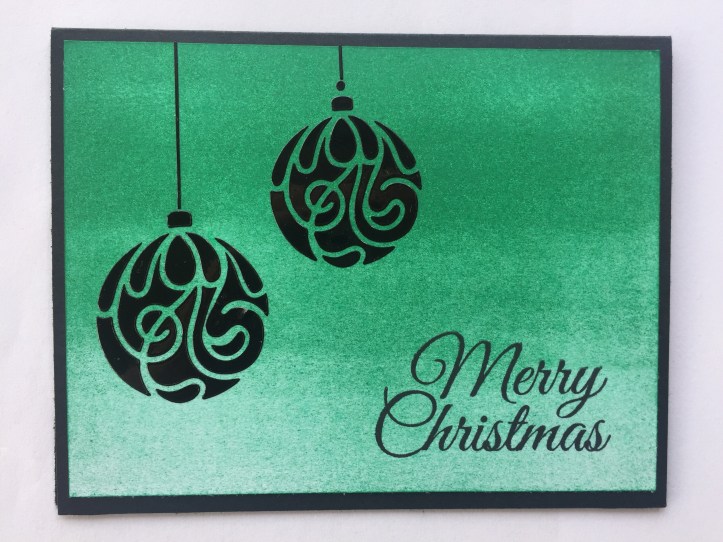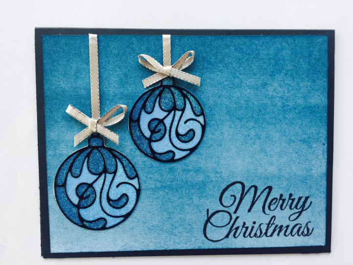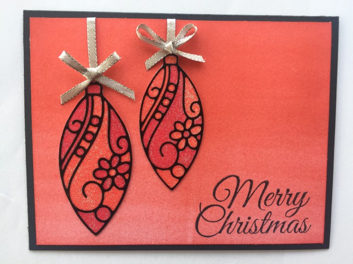 The ornaments I had previously coloured were already cut out and ready to go. I just attached them to the card fronts and added some ribbon, and then stamped the Merry Christmas sentiment.
