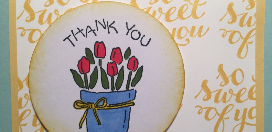 I punched out a 2.5″ circle, and used a stamp from the ‘Nice and Easy Notes’ set, this set is also retired but I love it. See more of what I have done with it here. I coloured it in using alcohol markers, and then sponged some daffodil delight around the edges to tie it in.