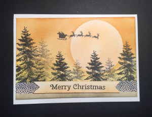 I found a YouTube video by Kelly Acheson over at A Stamp Above and she made these gorgeous cards using sponging, trees, a flying santa and glitter – how could this not turn out gorgeous! I have done a similar card before – actually I think it was one of the first cards I made. The cards Kelly made were actually quite similar, however she used a huge moon and added the glitter, and I think this took them to the next level. They were so pretty! Thank you Kelly 🙂