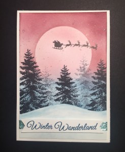 The moon is masked using a 2.5″ circle – the only circle punch larger than 1″ that I owned. The flying santa stamp comes from a retired Stampin’ Up set called ‘Holiday Home’. The trees come from a Kaisercraft set, I actually don’t like how this tree stamps at all – I really should just order Lovely as a Tree from Stampin’ Up!