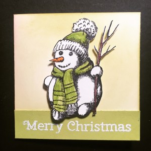 After fussy cutting out the snowmen I popped them up on a few dimensionals to give the card a bit of depth. Each of the sticks that the snowman is holding are slightly different – mostly because I am an impatient cutter and I got carried away a couple of times 🙂