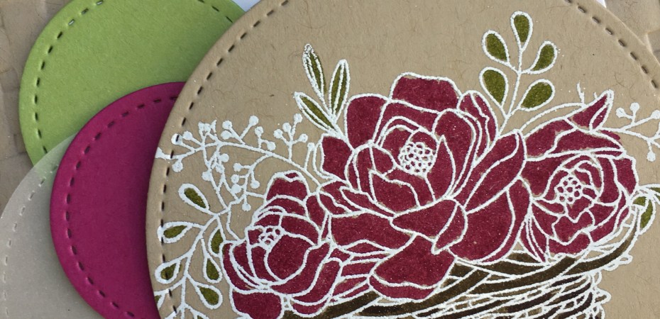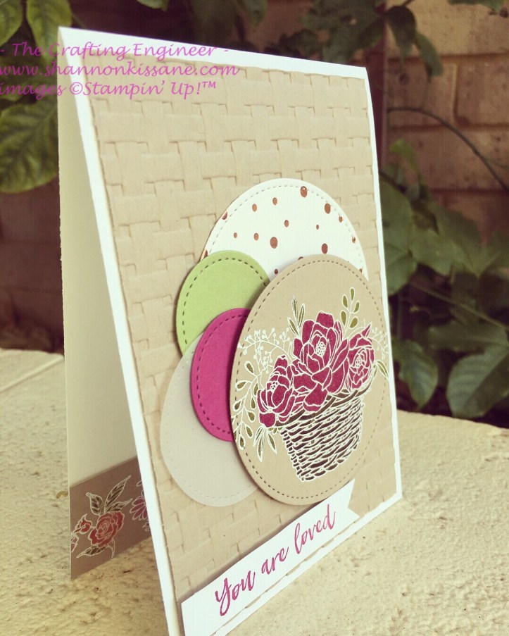 Both cards are on a whisper white card base, with a crumb cake mat that has been embossed with the Basket Weave embossing folder. The additional cicles for the circle card have been cut out of berry burst, old olive, velllum and a piece of springtime foil speciality DSP (also earned for free during Sale-A-Bration!).