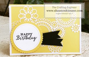 The DSP I have used is called Delightfully Detailed Laser Cut Speciality paper. It is amazing – really so pretty. This paper is what you would get if you had a stash of detailed and intricate dies at the ready, but not everyone has that. So again – a gorgeous set of paper to allow someone starting out the ability to make beautiful things with minimal outlay. The paper comes in a pack of eight pieces, 4 of each of the two designs. The first design is a full 12″ x 12″ piece of a detailed floral pattern. Use it whole for a scrapbook page, use your snips to cut out individual flowers to use as embellishments, cut out small sections to use as card fronts, use it as a mask and sponge colour onto your card or use a sponge dauber to add colour straight to the paper itself. So many options here – but one thing you don’t want to do is use your Stampin’ Trimmer to try and cut it. It won’t work as it is too delicate and you will end up tearing it.