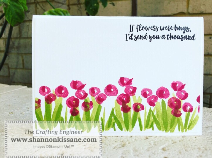 These stamps are what we call 2-step stamps, as in the image is created in two steps. The greenery is stamped in Granny Apple Green, the lighter colour is achieved by stamping off onto scrap paper first. The detail is then stamped over the top with full strength ink. The flowers are stamped in a similar way using Lovely Lipstick.