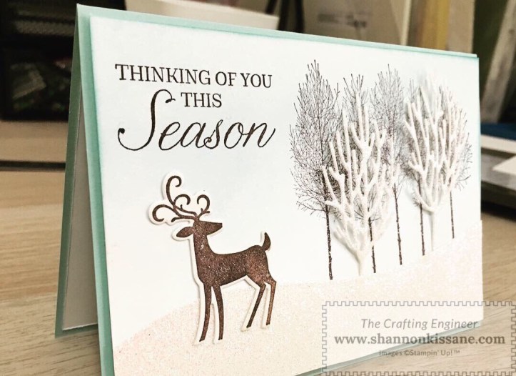 Before adhering them to the background piece I stamped the trees and the sentiment in Early Espresso. After I stuck everything down I decided I needed something extra and added a deer from the Dashing Deer bundle.