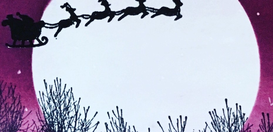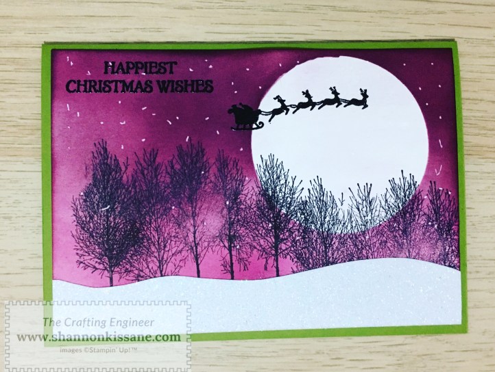 I started by masking out the moon using a 2.5″ circle of post-it note. Then I sponged then background using Rich Razzleberry and Blackberry Bliss. The trees are from Winter Woods and are stamped in black memento ink. Finally – the snow bank at the bottom is free cut from some glimmer paper.