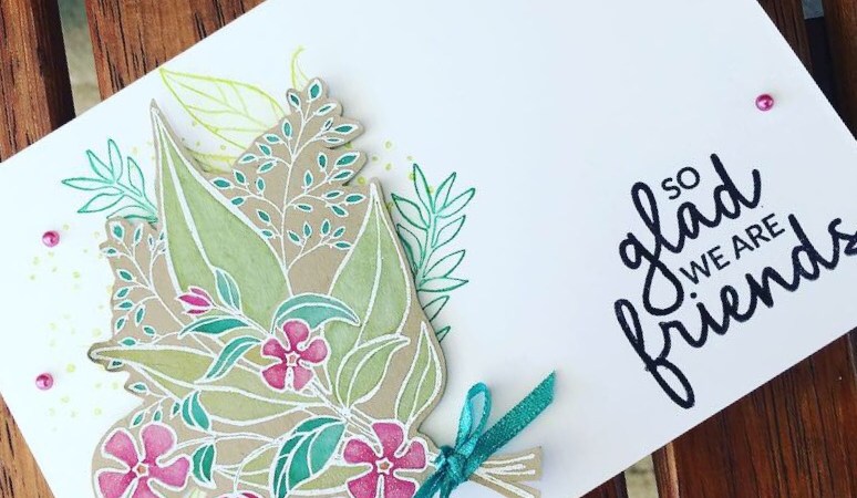 Then, the image was coloured in using white craft ink and an aqua painter. Finally – after the image is completely dried, I coloured it again using coloured inks, only this time instead of an aqua painter I used wink of stella. This works exactly like an aqua painter, but gives it a nice glittery shimmer.