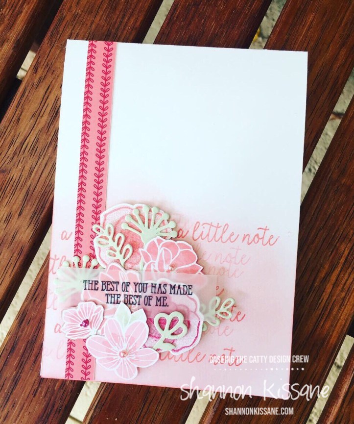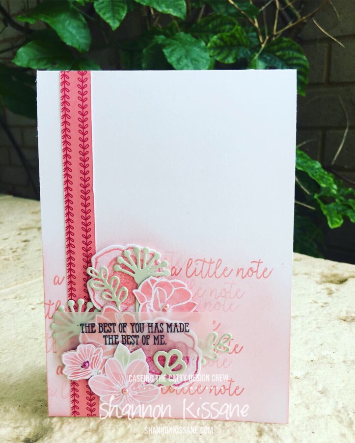 The card I have chose to CASE this week, is the white one shown above, with the cluster of pink embellishments. I loved the simplicity of this design, but I especially loved the sentiment being stamped on vellum. I thought it added a really pretty touch.