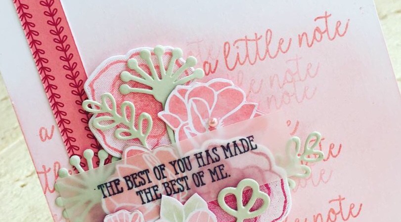 I started my sponging some Flirty Flamingo onto a thick whisper white base, and then stamped ‘A Little Note’ straight onto the card base. I then clustered an assortment of flowers and greenery, the majority of the flowers were actually fussy cut from the All My Love DSP pack.