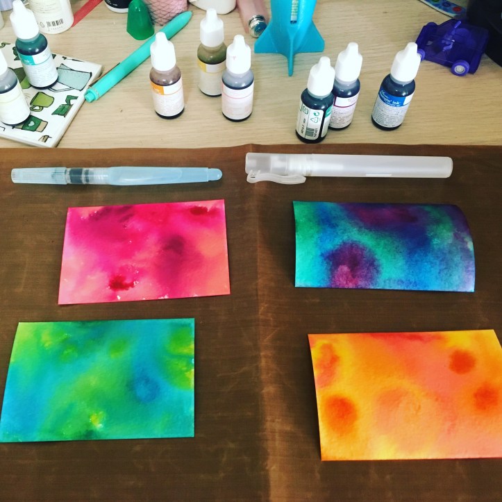 For each piece of paper I selected 3 re-inkers that I thought would work well together, and I put around 3 drops of each into seperate wells of a small paint tray. Using a spritzer I sprayed a generous amount of water onto a piece of watercolour paper, and then used my aqua brush to drop droplets of re-inker onto the card stock. I did add a very small amount of water to the re-inker well before picking it up to drop, but not much. I wanted very vibrant colours. As soon as you drop some ink, you will see it move with the water on the paper. If it doesn’t move as much as you want, spritz some more water. There is really no right or wrong with this technique – just have fun.