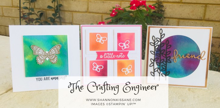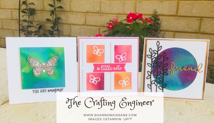 So, four background pieces from one sheet of watercolour paper, created 3 different cards (and gave me some cool left over bits). I am really pleased how these came out. I hope you will give this technique a try and let me know how you get on. I’ll link to the main materials required for this technique (some of the re-inkers are retired, but I would recommend the brights – they are my favourites!), but use what you have. I won’t list all the stamp sets and dies as I think this would overwhelm. This blog post is all about the background pieces and you don’t need much for those. This is definitely a ‘nothing fancy required’ technique – will the exception of using a good quality water colour paper. Don’t cheap out on this part, as the cheaper paper (I have tried the one in Kmart) really doesn’t work so well for this. It can’t take this amount of water and liquid and will start to pill on you.