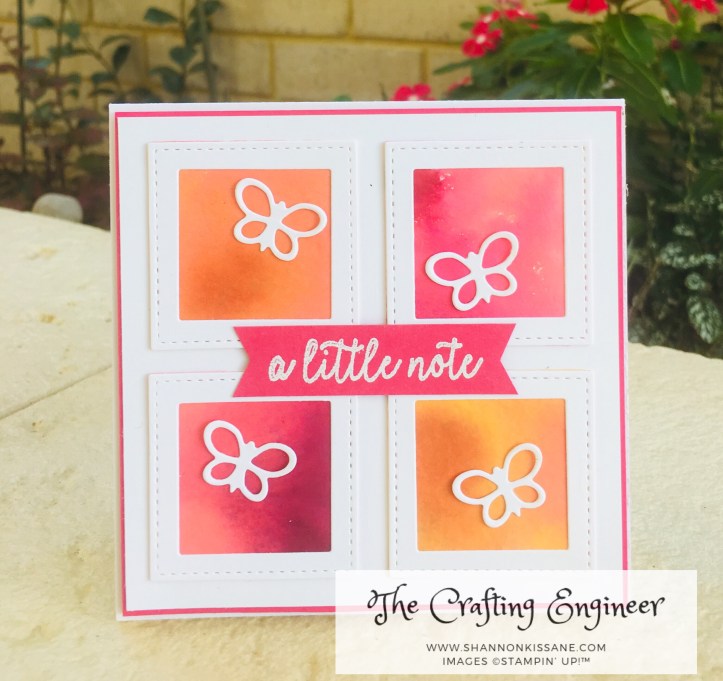 Now for the cards. Given the size of the panels I had created, I decided on doing square cards sized at 10.5cm x 10.5cm. For the first card I used the two smallest stitched squares to not only cut the background pieces, but to also cut some white frames. I used both the pink and the orange pieces for this card. I matted the squares onto a whisper white panel, and then added a panel of melon mambo. The sentiment is from Butterfly Gala and its heat embossed in white on a scrap of Melon Mambo. To finish it off I added some small die cut butterflies that are from the Well Written Framelits.