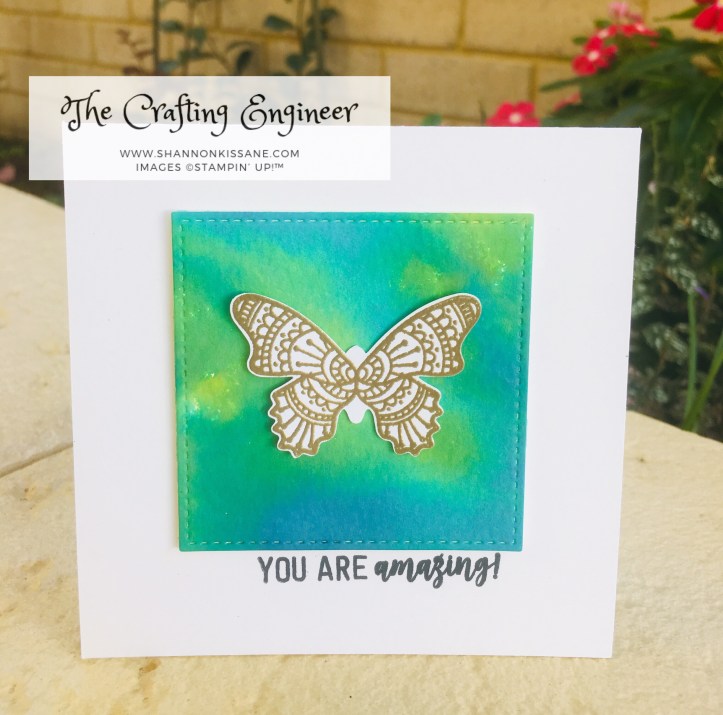 For the second card I kept it really really simple. I cut a square panel using the largest stitched square, added a butterfly (from the Butterfly Gala stamp set) heat embossed in gold and used a ‘jack of all trades’ sentiment from the Amazing Life stamp set.