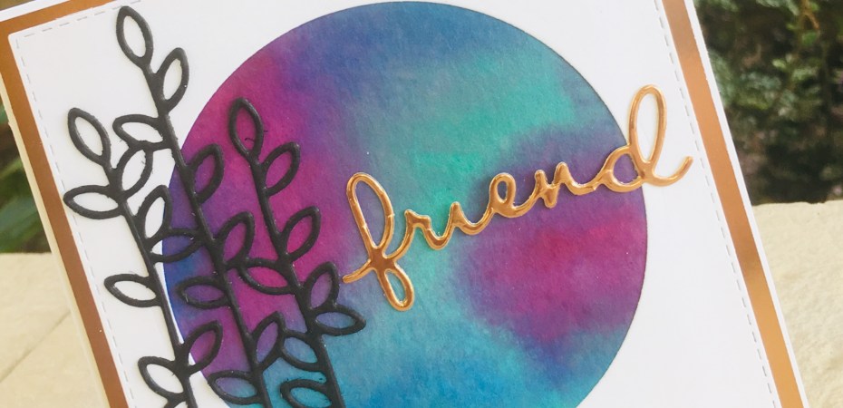 I then used the largest stitched circle to cut away the middle section of the square, and stuck this down on my watercolored background piece. I kept the embellishment and sentiment (both from the Well Written framelits) simple, but I did cut the sentiment in copper (as well as adding a copper mat) for some fancy shine. I highly recommend using adhesive sheets when cutting out sentiments or delicate dies like on this card, it makes sticking them down an absolute breeze.