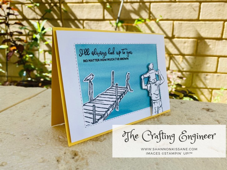 I then layered on a stitched rectangle frame and a die cut jetty from the By The Dock bundle (in the mini catalogue). Finally I fussy cut one of the images from the ‘A Good Man’ stamp set (from the annual catalogue). I thought this image was a perfect match for the sentiment I picked which is also from the By The Dock stamp set. I umm’d and ahh’d about where to put the sentiment – to banner or not to banner but in the end I decided to stamp it straight onto the water coloured panel. Since this was the very last thing I did I used my stamparatus so that I wouldn’t mess it up and to make sure it was nice and dark.