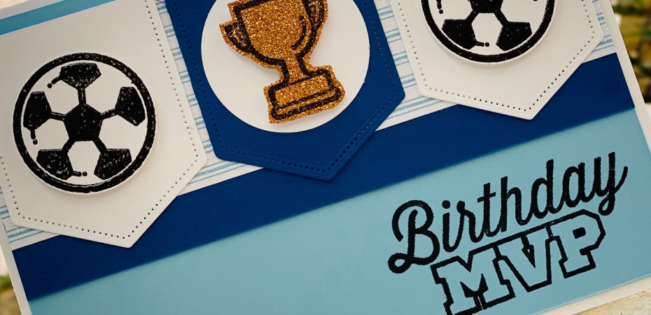 For this weeks card I have used kept to the ‘three panels’ but I have gone for different shapes. The stamp set used is from the annual catalogue and is called ‘For The Win’. I heap embossed the soccer balls in black, and stamped on glimmer paper for the trophy. The DSP is from the Come Sale Away DSP pack.