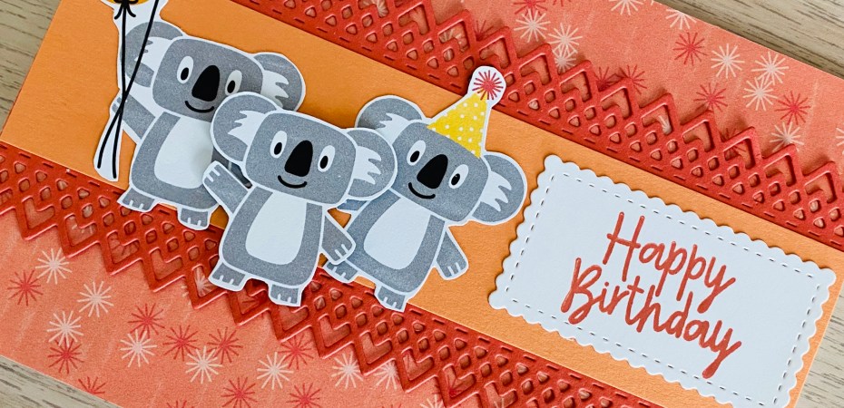 The Happy Birthday sentiment comes from the Bonanza Buddies stamp set and is on a panel cut from the Stitched So Sweetly dies. The cute little Koalas were added with some dimensionals, and the card was ready to go.