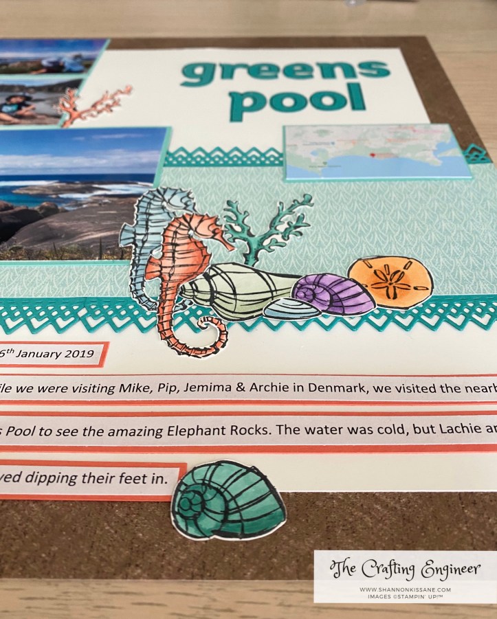 To embellish the page I have stamped a heap of images from the stamp set Seaside Notions, coloured them with blends and cut them out. Both pieces of DSP are from the newly retired Tropical Oasis paper pack, and I have also used the retired Delicate Lace Edgelit dies.