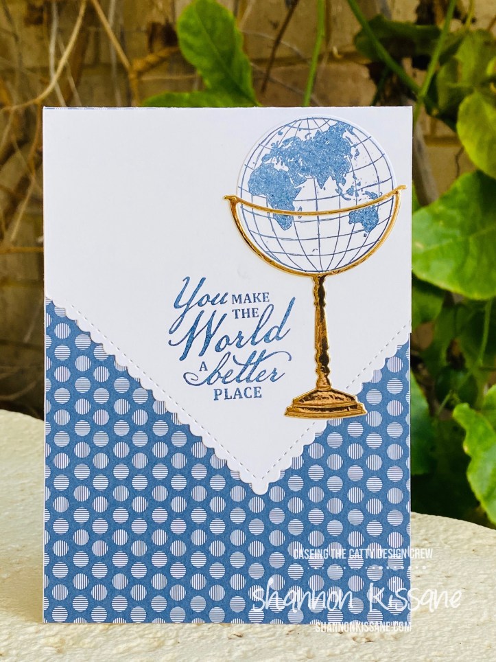 For my misty moonlight card, I have used a stamped image from the Beautiful World Bundle that I have then die cut out. I also die cut the globe stand in brass foil. I actually stamped and cut two of these globes out – one for this card and one for ‘ron.