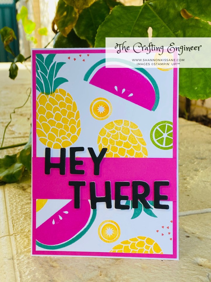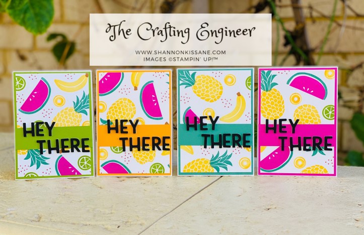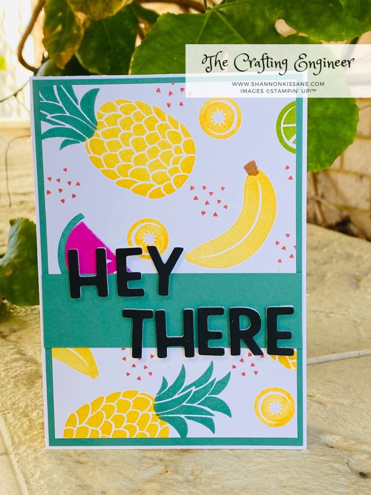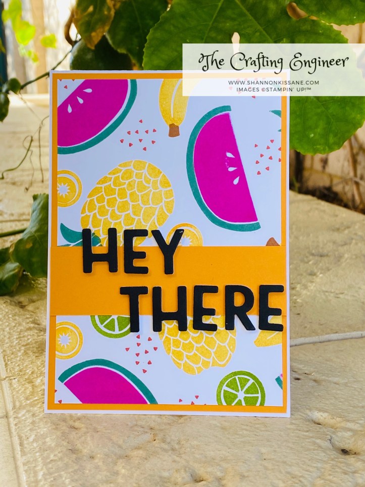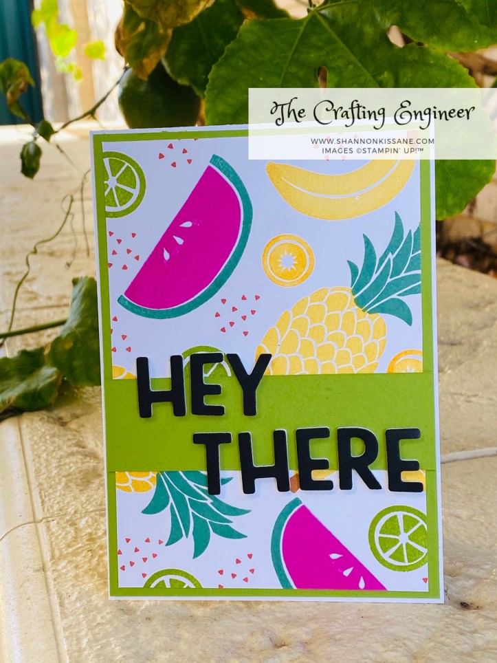 The theme this week is Thinking of You, which I have loosely interpreted as making a card just to say Hi – no big occasion, just Hi, I’m thinking of you. This was a fabulous excuse to play with some new goodies that arrived during the week! The stamp set I am featuring is the aptly named ‘Cute Fruit’ – and if you are thinking to yourself that you don’t remember seeing this set in the Annual Catalogue…..you would be right! Did you know that Stampin’ Up! has a beginners brochure (Check the link to it under the menu item ‘Ordering Info’), aimed at the beginner stamper? It has some unique products, and some coordinating products, and some products that are also in the annual catalogue but are presented in a starter kit to make starting out that much easier. I couldn’t resist buying this set when I first saw it – it is absolutely cute!