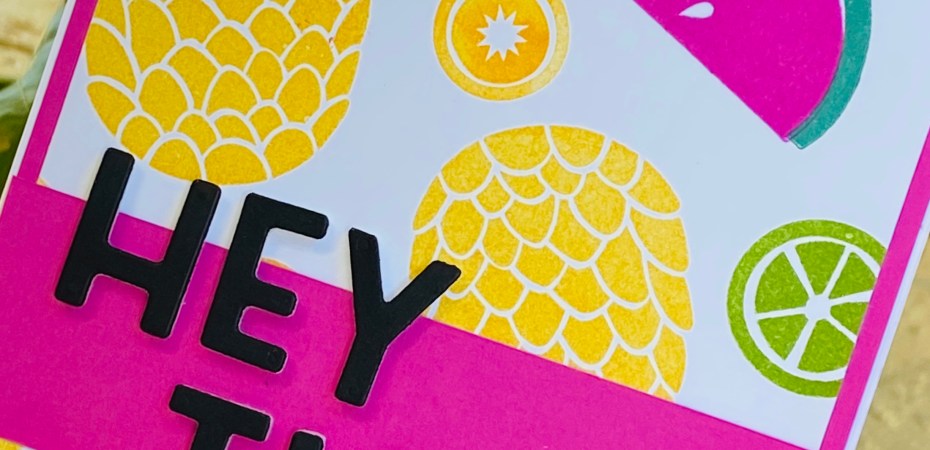 The theme this week is Thinking of You, which I have loosely interpreted as making a card just to say Hi – no big occasion, just Hi, I’m thinking of you. This was a fabulous excuse to play with some new goodies that arrived during the week! The stamp set I am featuring is the aptly named ‘Cute Fruit’ – and if you are thinking to yourself that you don’t remember seeing this set in the Annual Catalogue…..you would be right! Did you know that Stampin’ Up! has a beginners brochure (Check the link to it under the menu item ‘Ordering Info’), aimed at the beginner stamper? It has some unique products, and some coordinating products, and some products that are also in the annual catalogue but are presented in a starter kit to make starting out that much easier. I couldn’t resist buying this set when I first saw it – it is absolutely cute!