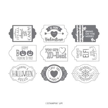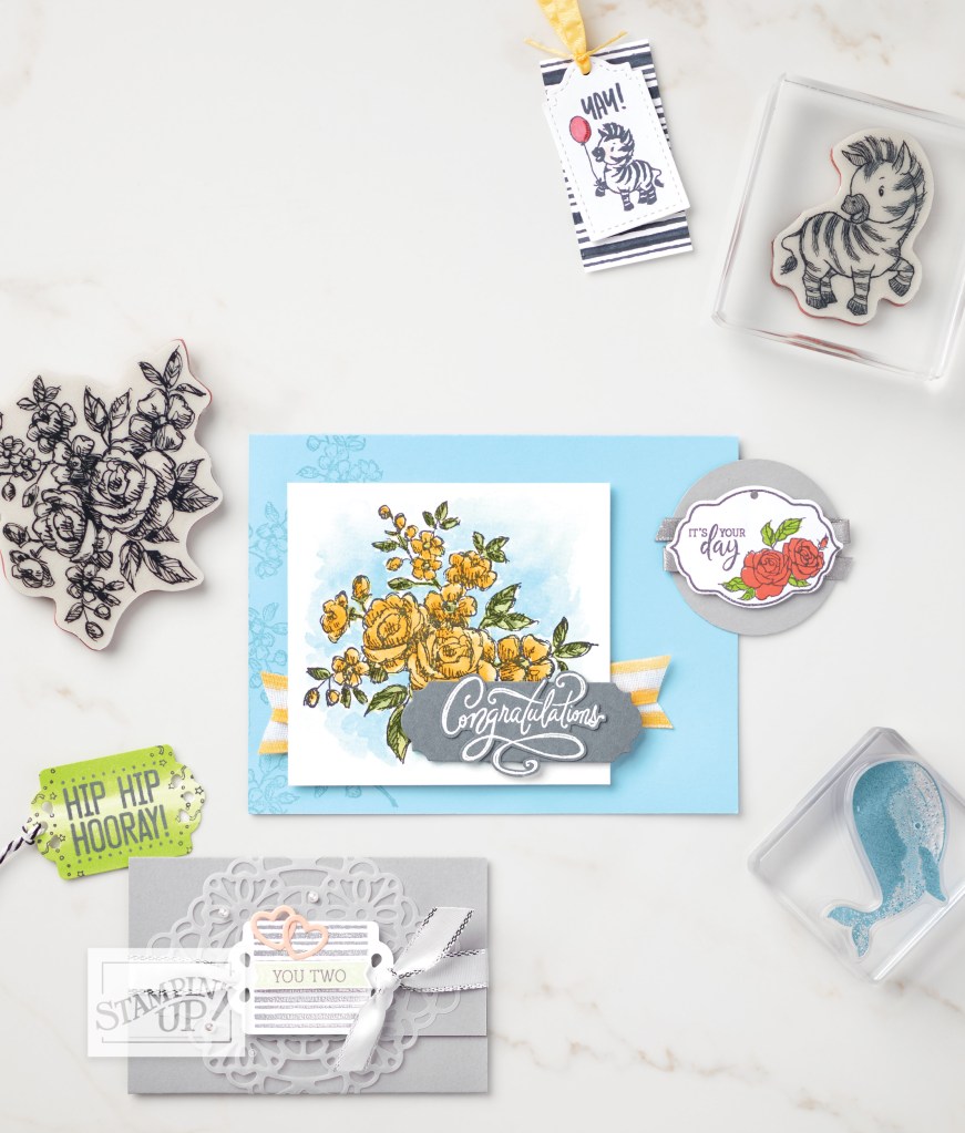 As I was flicking through the catalogue looking at all the animals, I found this very cute gift tag on page 52 – complete with a zany zebra! I thought it was super cute, and it was a good reminder to use a die that I haven’t used as much as I had originally thought. This die was initially bundled with the Tags Tags Tags stamp set (shown in the middle below, still available to purchase), but in this years catalogue we have an additional coordinating stamp set called Celebration Of Tags (shown on the right below).