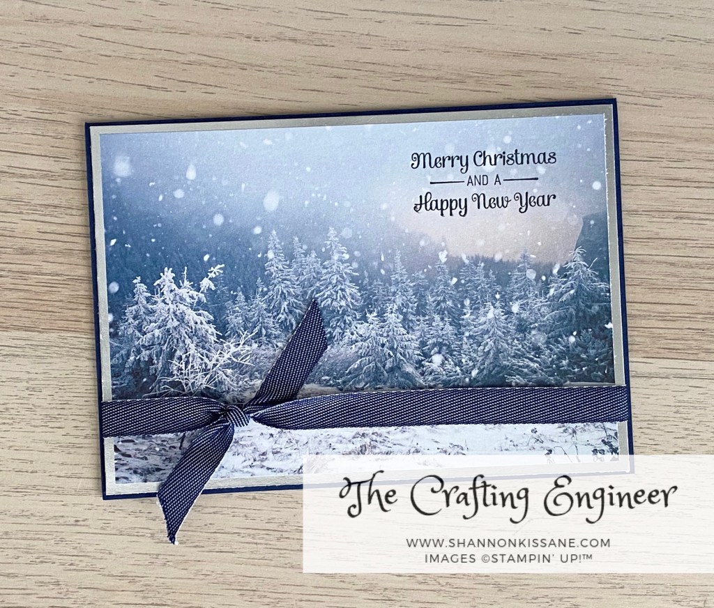 For this first card I have used a piece of silver foil behind the DSP and added a piece of Denim ribbon. The sentiment comes from the stamp set Itty Bitty Christmas (from the annual catalogue).