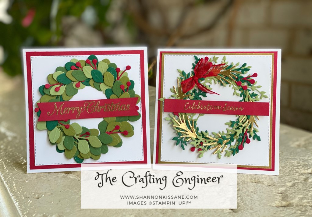Since I haven’t bought this bundle yet, I set about creating some wreaths with the dies I already own. For both of the wreaths I have combined the colours Pear Pizazz, Garden Green, Old Olive and Shaded Spruce. The red holly berries are cut from Real Red using the one of the dies in the new Poinsettia dies in the August-December mini catalogue going live on the 4th August.