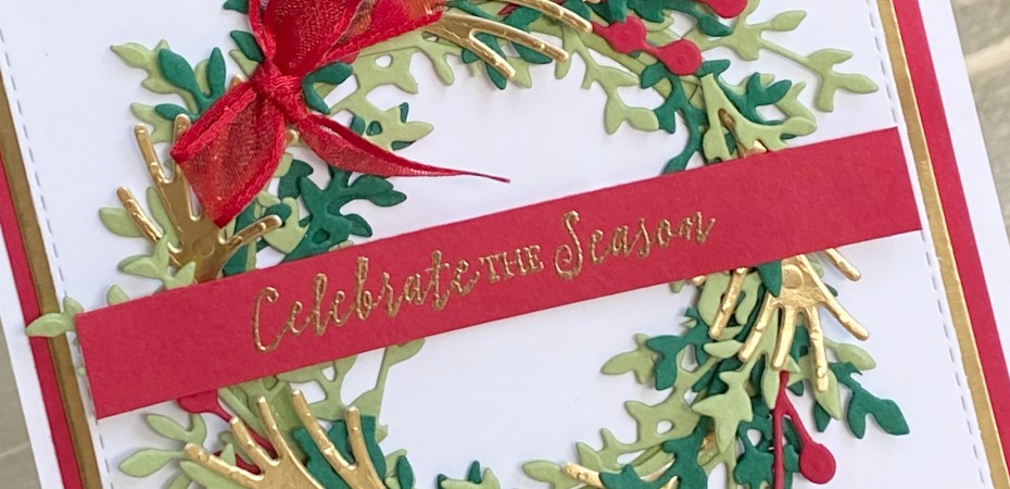A good tip for you when making wreath cards, I create a circular base to start with by using the layered circle dies. But prior to cutting out the circle I use an adhesive sheet on the card stock. That way my circular base has some sticky on it to get me started. Starting on a base also ensures I end up with a reasonable circular shape.
