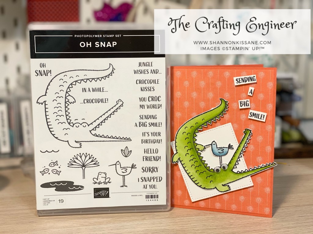 But also – don’t forget about the January – June catalogue that is still live and available to shop from for another couple of months. To inspire you all, here is a card I made yesterday using the Oh Snap stamp set. I’ve coloured the croc using Stampin Blends and fussy cut him out. The background DSP is from the Dandy Garden DSP pack.