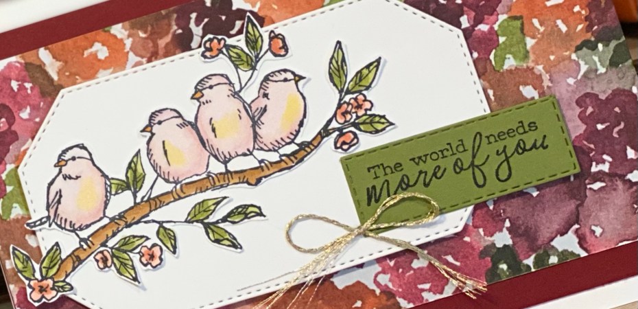 While I am waiting for my recent new catalogue order to arrive, I had a play using an old stamp set (that carried over into the new catalogue) – Free As A Bird and I have combined it with some brand new DSP called Beauty of the Earth. This paper pack is stunningly gorgeous – you’ll love it.